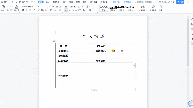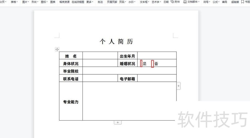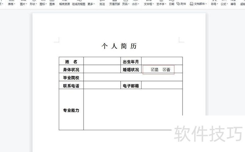 将鼠标光标移至需输入带方框勾或叉的位置,例如在婚姻状况后要输入时,就把鼠标置于该处即可。