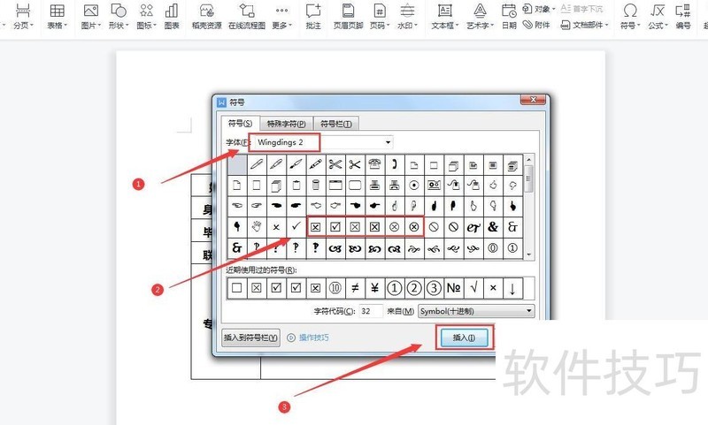 点击--,在符号对话框中将字体设为Wingdings 2,找到带方框的勾或叉符号,选中后点击插入按钮即可完成操作。