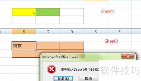 依次选择:出错警告→样式设为停止→错误信息,然后在错误信息栏输入:请先输入Sheet1中B2和C2单元格内容。