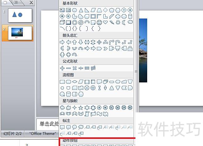 点击形状下拉箭头,于菜单中定位动作按钮区域,选取所需按钮样式并单击。