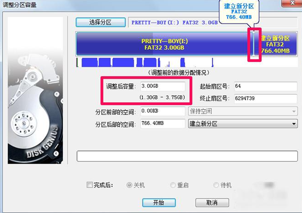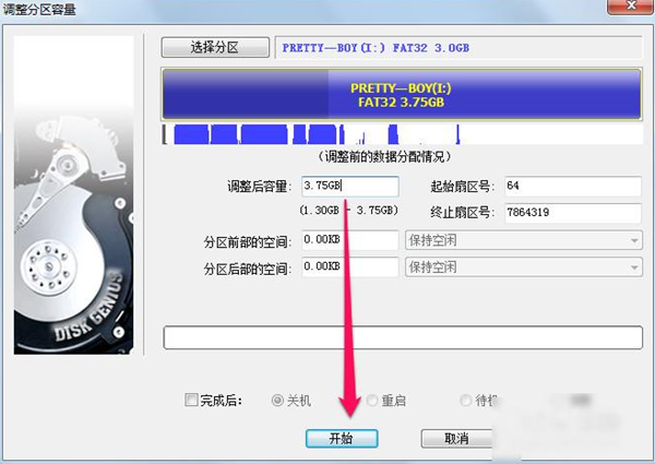 7、设置好容量后,点击"开始",等待合并分区处理完成即可。