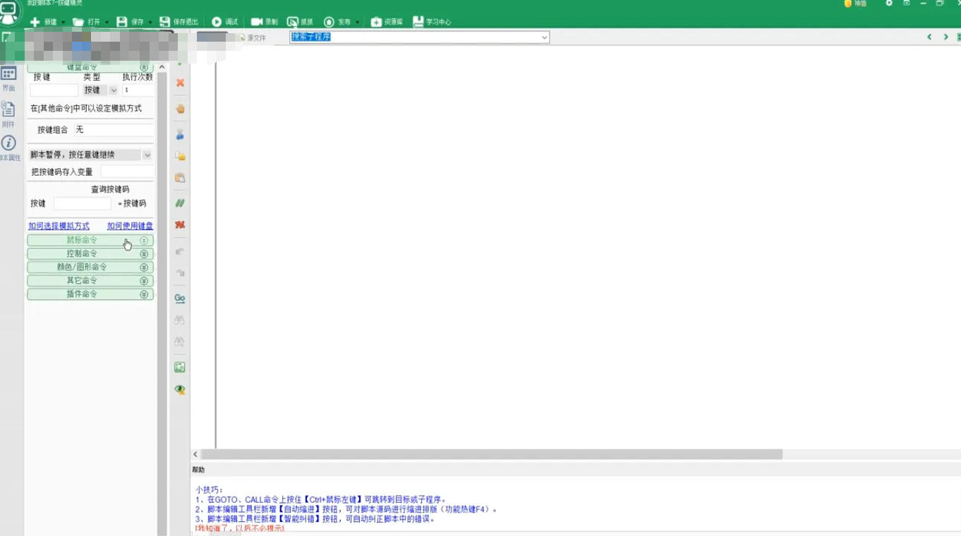 返回脚本编辑界面,点击左侧命令栏中的 “鼠标命令”(图标为鼠标形状)。