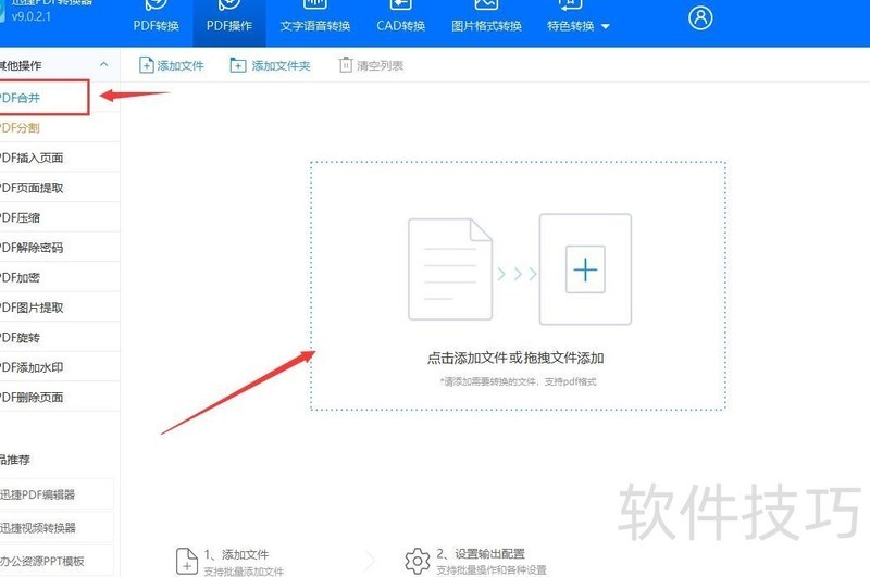打开迅捷PDF转换器,点击顶部PDF操作,选择左侧PDF合并功能,将两个或多个PDF文件导入页面中央区域即可完成添加。