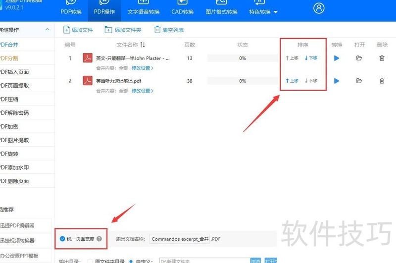在操作界面点击排序选项,可上下移动合并文档中的页面以调整顺序;若PDF页面尺寸不同,左下角提供统一页面宽度功能进行设置。