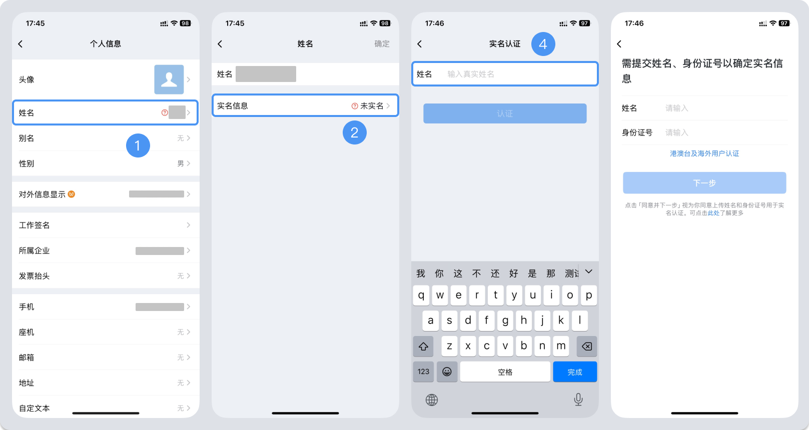 1、实名入口:【手机端->消息界面左上角“三”->头像->个人信息->姓名->实名认证】