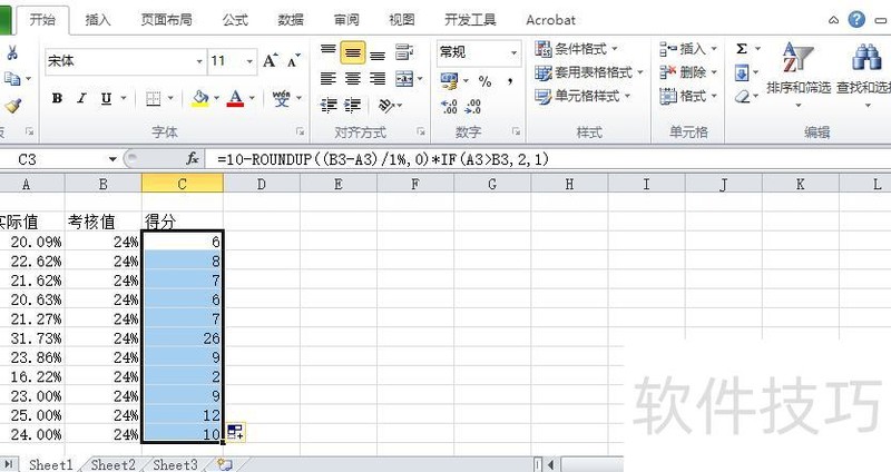 ROUNDUP((B3-A3)/1%,0) 计算与标准值相差的百分点数,IF(A3>B3,2,1) 表示每低1点扣1分,每高1点加2分。