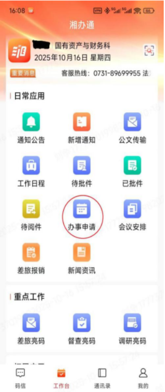1、发起申请:省内党政机关事业单位公务人员因一般性公务外出时,需登录“湘办通”APP,点击"办事申请"。