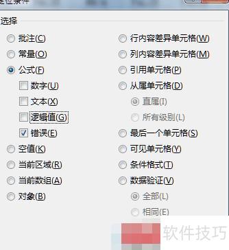 保持辅助区域选中状态,按F5键打开定位对话框,点击定位条件,在弹出的窗口中选择公式,取消勾选数字、文本和逻辑值,仅保留错误选项,最后点击确定完成设置。