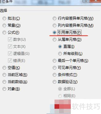 再次按下F5键,选择定位条件中的引用单元格,然后点击确定。