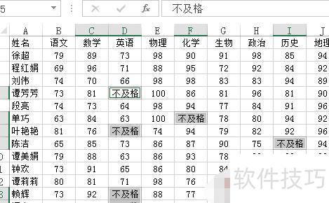 此时,B2:J34区域内所有小于60的单元格将被选中,这些正是辅助区域中产生错误值的公式所引用的单元格。在编辑栏输入不及格后,按下Ctrl+回车键,即可将所有小于60的数值批量替换为不及格。