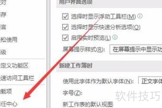 在Excel选项窗口左侧栏,选择信任中心菜单项。