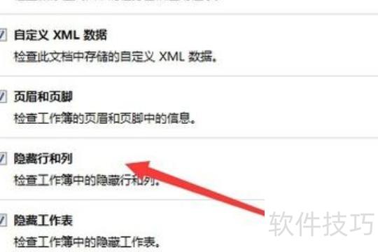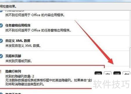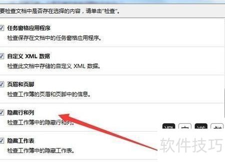 在文件检查器窗口中,向下滑动右侧滚动条,找到隐藏的行和列,并勾选其前方的复选框。