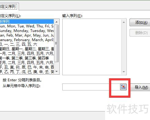 进入文件菜单,选择选项中的高级,向下滚动至编辑自定义列表,点击导入旁的方框按钮,选取所需序列后导入,最后点击确定完成设置。