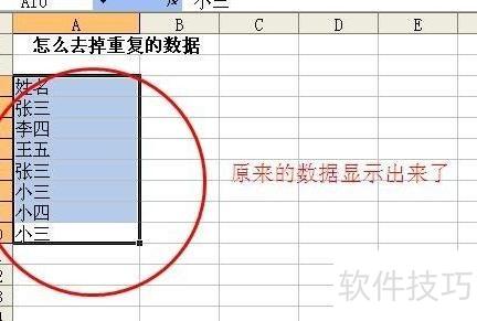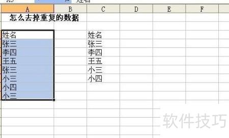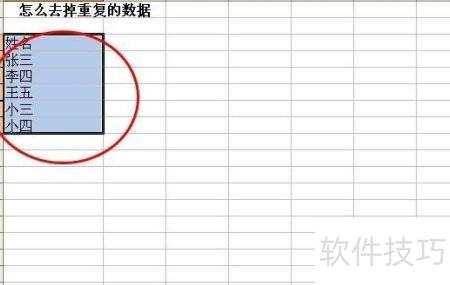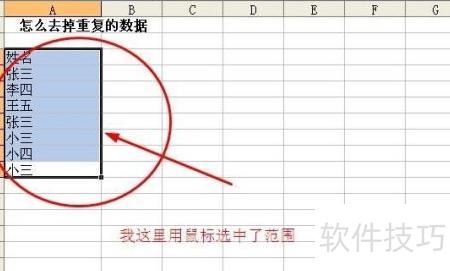 此处为测试,仅输入了简单数据。用鼠标选中需去除重复数据的区域即可。