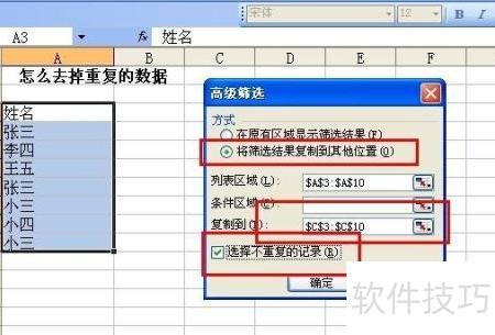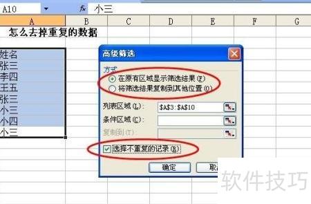 在高级筛选窗口中,勾选选择不重复的记录,并设置在原区域显示结果,确认后点击确定即可。