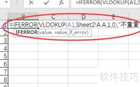 返回第一张表,输入公式:=IFERROR(VLOOKUP(A1,Sheet2!A:A,1,0),不重复)。该公式用于比对表1的A1单元格与表2的A列数据,若存在相同值则显示该值,否则显示不重复。