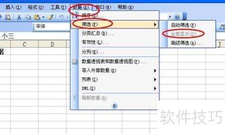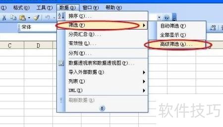 将鼠标悬停在筛选选项上,会弹出包含自动筛选、全部显示和高级筛选的窗口,我们直接点击高级筛选即可。