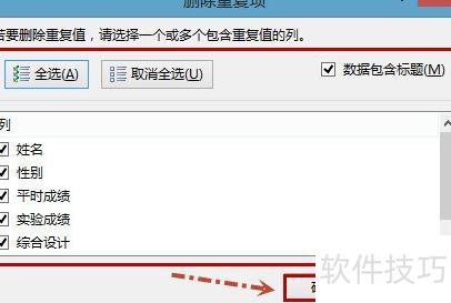 在数据选项卡的数据工具组中点击删除重复项。