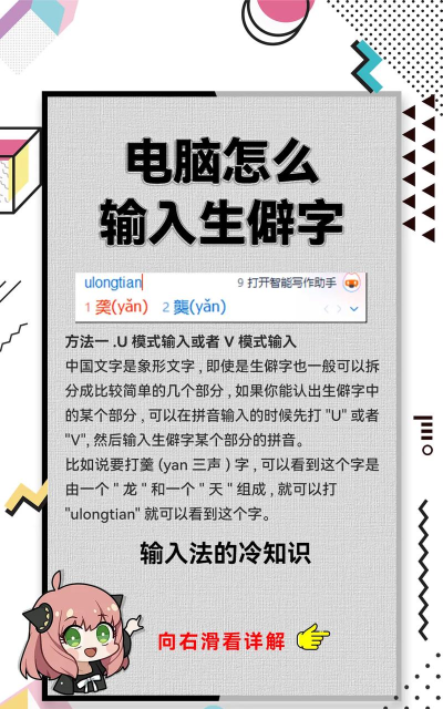 1、 拼音输入法,你的基础武器其实,大多数生僻字,都可以用拼音打出来,不过,你需要知道它的正确读音,比如“焱”字,读作“yàn”,你只需要输入“yan”,然后在候选词里找,就能找到它,当然,有些字的读音比较特殊,或者你根本不知道它怎么读,这时候,拼音输入法就有点力不从心了,所以,拼音是基础,但并非万能。