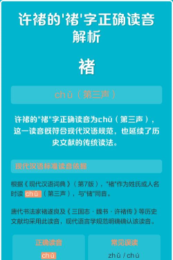 但是,在许褚这里,它只能读chǔ,这是,历史人物的,固定读法,就像,我们不能把,曹操,读成cáo cāo一样,名字的读音,是有规定的,不能随意更改。