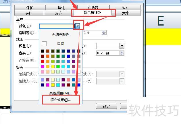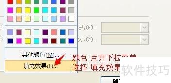 选择颜色与线条,点击颜色右侧箭头,在弹出菜单中选取填充效果。