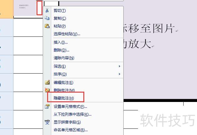 七、右键点击图片单元格空白处,选择弹出菜单中的隐藏批注选项。