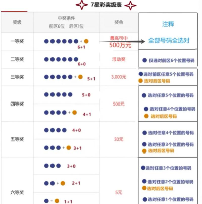 2、中奖规则分等级中奖不是全对才行,它分很多等级,一等奖要求最高,需要7个号码,全部按顺序对上,二等奖呢,需要对上6个,再加特别号码,三等奖,对上6个号码就行。