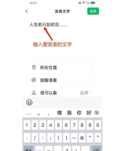 在这里,你可以输入想说的文字,文字内容可以随心所欲,分享心情、记录事件都可以,同时,你还可以为这条朋友圈选择可见范围,比如“公开”、“私密”或“部分可见”,甚至,可以提醒特定好友来看。