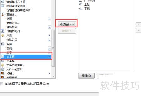 此时将显示插入菜单下的全部按钮,在列表中选择文本框,点击选中后,再点击中间的添加按钮,最后点击确定完成操作。