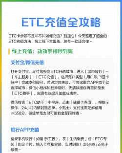 开车上高速,ETC真方便,但余额不足时,充值却让人头疼,其实,ETC充值早已告别单一模式,变得非常灵活,无论你习惯线上操作,还是偏好线下办理,总有一种方法适合你,让你随时随地,轻松搞定充值问题,再也不用担心排队烦恼。