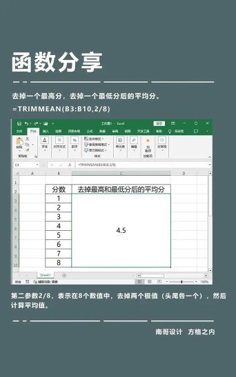 其中,TRIMMEAN函数用于计算数据集中去掉一定比例极端值后的内部平均值。该函数会从数据集的最高值和最低值两端各剔除指定百分比的数据点,再对剩余数值求平均。这种方法适用于需要排除异常分数干扰、提升评分公正性的场景。