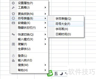 在输入法条形框任意位置右击,选择符号表情中的符号大全。