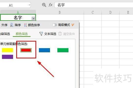 进入颜色筛选界面,表格中所有颜色将显示出来,以红色为例,点击红色即可完成筛选。