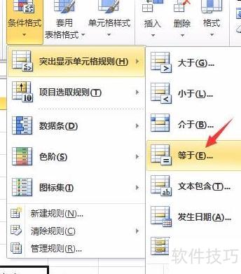 依次点击开始→条件格式→突出显示单元格规则→等于,操作所示。