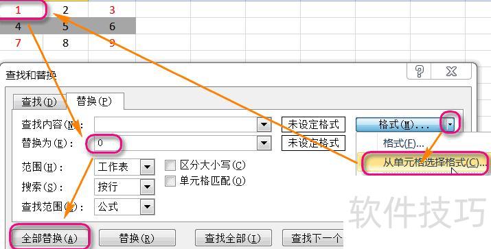 在查找和替换对话框中点击选项展开面板,选择单元格格式,设定查找红色字体的单元格,替换内容设为0,最后点击全部替换完成操作。