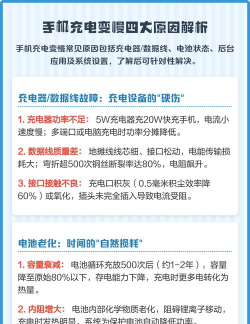 4、电池健康度下降对于使用较久的手机,电池本身会老化,这是不可避免的,电池的最大容量会衰减,充电循环次数也有限制,当电池健康度较低时,系统为了保护电池,可能会限制充电功率,导致充电变慢,你可以查看手机的电池健康状态,如果低于80%,就可能需要考虑更换电池了。