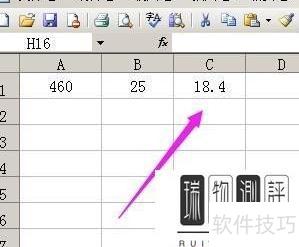 所示,A1单元格数值为460,B1单元格为25,将两数相除的结果显示在C1单元格中。