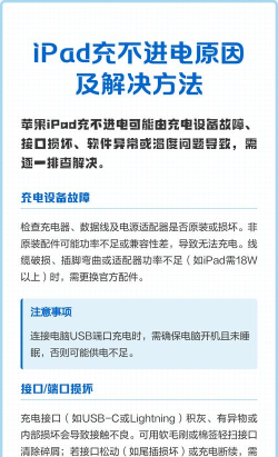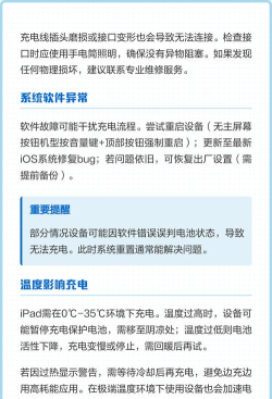 3、电池与硬件的潜在故障当然,也有可能是,硬件出了问题,比如,电池老化了,毕竟,ipad用久了,电池寿命会下降,可能,就无法正常充电了,或者,充电接口本身,损坏了,这就需要,专业的维修了,还有种情况,温度不合适,ipad太热,或者太冷,都会影响充电,把它放在,室温环境下,等一会儿,再试试,如果,这些方法都无效,那么,很可能,是内部硬件故障。