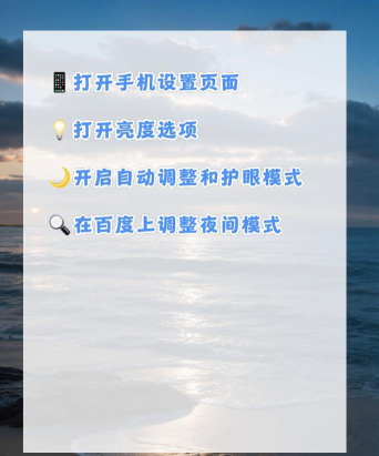 1、手机夜间模式开启方法现在手机都有夜间模式,开启后屏幕会变黄,光线更柔和,首先打开手机设置,找到显示与亮度选项,点进去就能看到,夜间模式或护眼模式,点击开启按钮,屏幕立刻变暖色,有些手机更智能,可以设置定时开启,比如晚上8点自动开,早上6点自动关,非常方便,不用每次都手动,另外亮度也能调,调到眼睛舒服为止,这样晚上刷手机,就不会刺眼了。