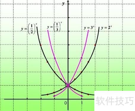 当底数在0到1之间时,函数递减;底数大于1时,函数递增。图像始终经过点(0,1),且全部位于x轴上方。