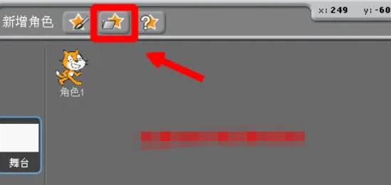 启动Scratch后,在舞台区右下方找到 「角色列表」(默认显示1个猫咪角色)。