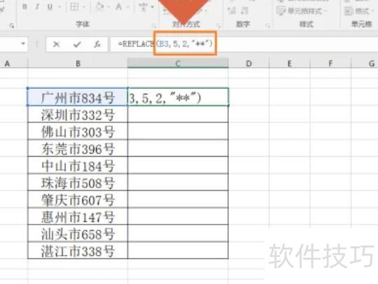 在编辑栏输入:=REPLACE(B3,5,2,),替换指定位置字符。