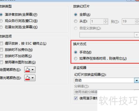 在切换选项卡右侧的换片方式中,可选择两种模式:单击鼠标换片或设置自动换片时间。前者适用于手动控制,后者用于自动播放。为统一操作方式,将所有换片设置为单击鼠标时,便于按需切换幻灯片内容。