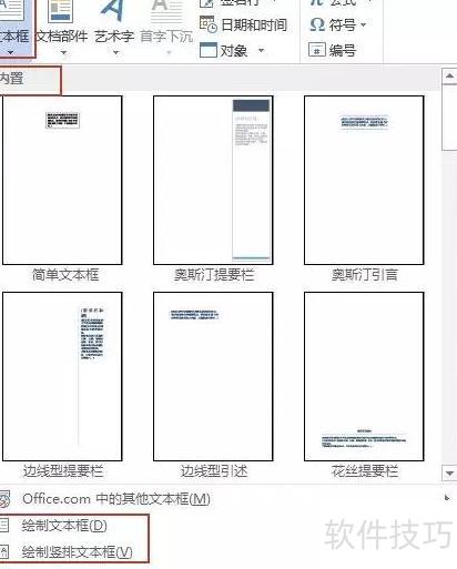 首先切换至插入选项卡,点击文本组中的文本框按钮,从弹出的快捷栏中选择内置样式,即可直接插入文本框。