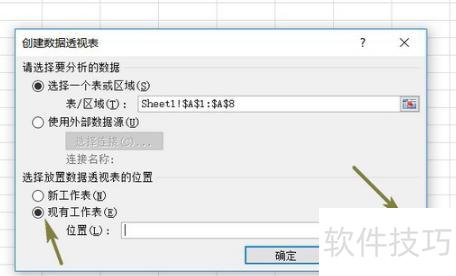 在创建数据透视表窗口中,选择现有工作表,点击位置栏末尾的小图标,任意选一个单元格,连续点击确定即可。