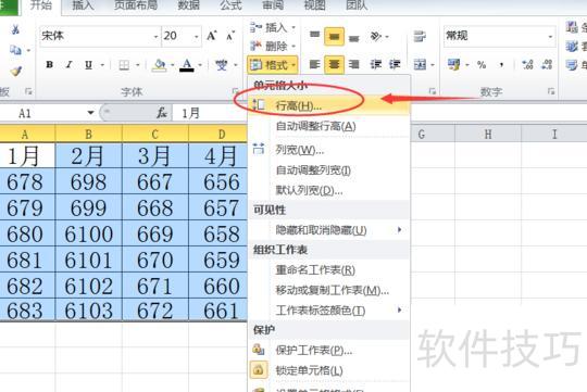 打开需调整行列大小的Excel表格,用鼠标选中目标单元格区域,在开始工具栏点击格式,从下拉菜单中选择行高,即可进行行高设置。