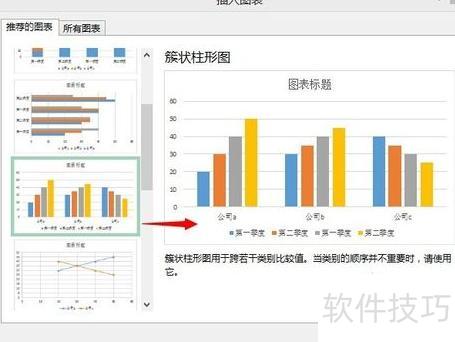 选中合并图表,点击插入→推荐的图表,选择簇状柱形图并确认。