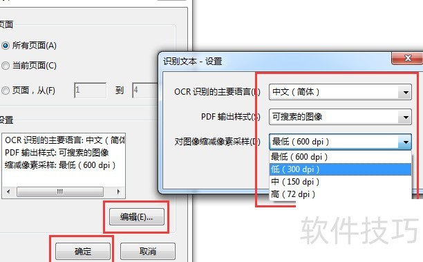 点击编辑,设置识别语言和采样像素,图像缩减选最低(600dpi),确认。