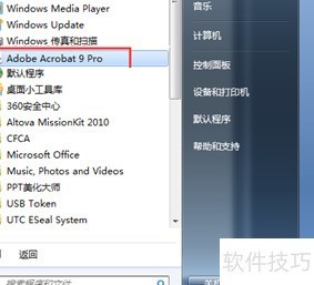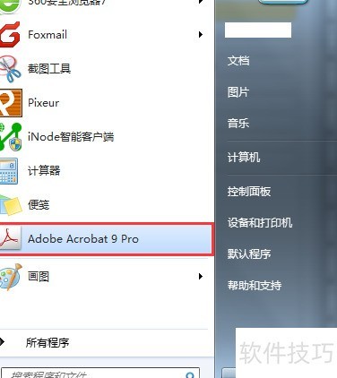开始菜单中显示Adobe Acrobat 9 Pro程序图标。