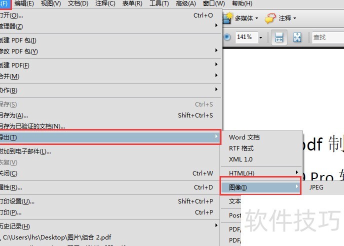 启动Adobe Acrobat 9 Pro,打开目标PDF文件,依次选择文档→导出→图像→PNG格式进行转换。